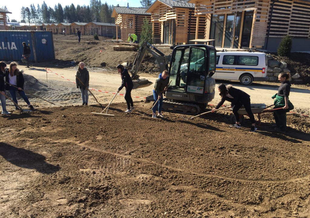Ausbilder Andreas Sedlmeir, Landschaftsgärtner Alexander Briechle und Auszubildende Carmen Volger zeigten den Schülerinnen nicht nur die Baubereiche. Bei einem Rundgang über die bereits bewohnbaren Bereiche der Parkanlage bekamen die Schülerinnen zu sehen, wie vielfältig die Arbeit einer Landschaftsgärtnerin ist: Pflasterarbeiten im Eingang und auf den Terrassen der Ferienhäuser, Rasenflächen zum Spielen, Grillplätze im Freien, Bachläufe und Adventure Golf. „Die Ferienanlage wollte ich mir eh schon mal anschauen, super!“, begeisterte sich eine der Schülerinnen. „Bei so etwas mitzubauen, das könnte ich mir später als Beruf schon vorstellen“, meinte eine andere.