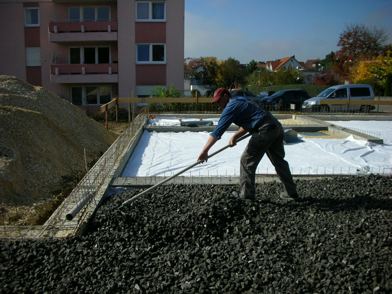 Der Einbau ist denkbar einfach, was gegenüber bisherigen Perimeterdämmungen Zeitaufwand und Kosten einspart. Planieren Sie ecoglas® lose und ggf. in Lagen auf. Verdichten Sie mit einer leichten Rüttelplatte oder Walze (1,3:1). Die gewünschte hohe Druckspannung baut sich durch die Verkeilung der Körner rasch auf.